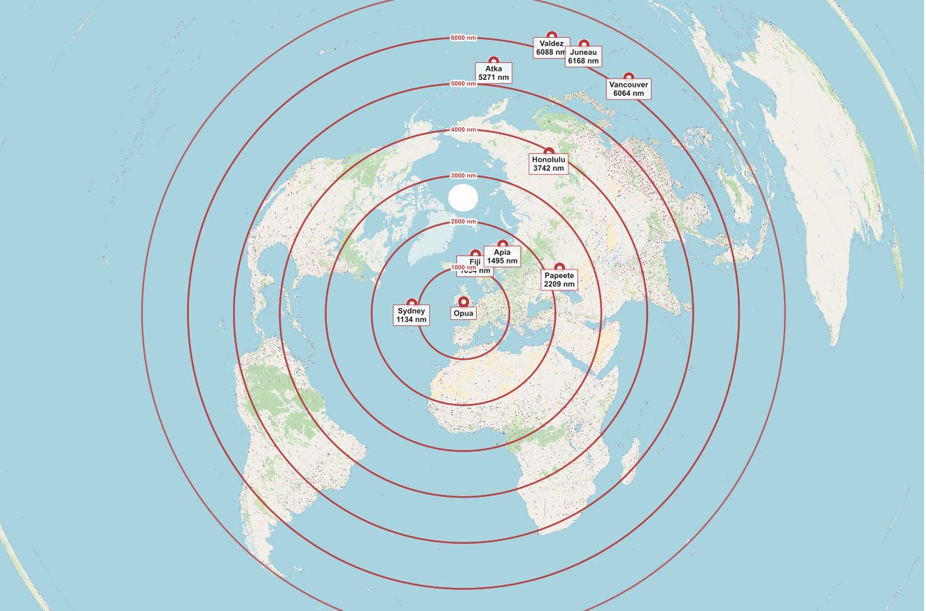 - Opua to Valdez: ~6,000 NM, give or take — about 11,000 km